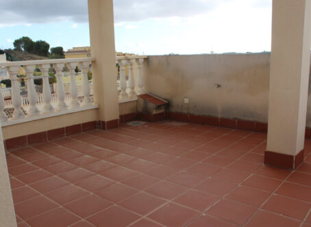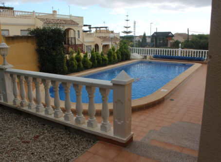 A South facing 3 bed 2 bath semi detached house with a private rooftop solarium & private swimming pool located in Montemar, Algorfa, Costa Blanca. This property is offered for sale in good condition, sold furnished & very briefly consists of the following :- On the ground floor there is a lounge / diner with a feature fire place, open plan fully fitted kitchen, separate utility area, 1 x double bedroom with fitted wardrobes & 1 x shower room. On the first floor are 2 x double bedrooms, 1 x family room, balcony & stairs up to a large private rooftop solarium with nice views over surrounding country side. Outside there is a large 352m2 plot with a private swimming pool, lots of off road parking, a covered front terrace, lovely communal swimming pool & much much more. This property is located less than 10 minutes walk to La Finca golf course where you will find 2 supermarkets, banks, hairdressers & several bars & restaurants. There is also a fantastic non membership clubhouse & a 5 star spa hotel. Algorfa village is a few minutes by car where you will find all amenities (banks, supermarkets, bars, restaurants, shops, pharmacy, doctors, local bus etc.). It is just 15 minutes drive to the beautiful Blue flag beaches at Guardamar Del Segura & around 35 minutes drive to Alicante airport & around 50 minutes to Murcia Corvera airport.