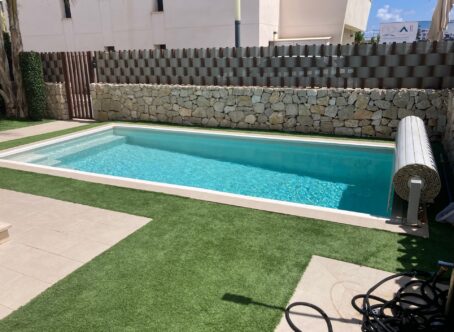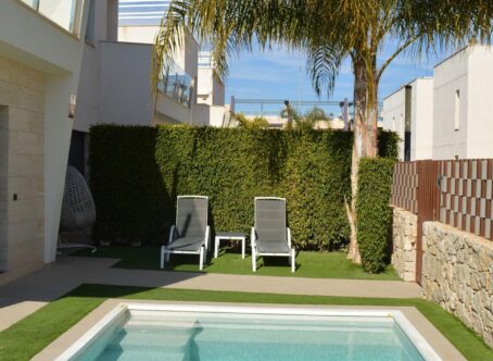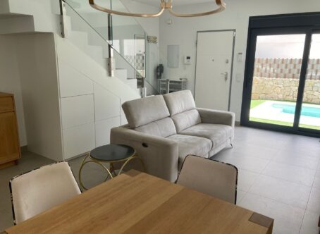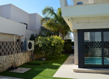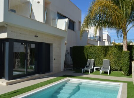 We present an exclusive semi-detached villa located in Torre de la Horadada, just 150 meters from Las Higuericas beach. Located in a quiet area, surrounded by parks and low-rise buildings, this property offers privacy and comfort. Main features of the property: Surface area: 136 m² built (108 m² useful) Distribution: 3 spacious bedrooms, living room with open kitchen and 2 functional bathrooms Terraces: a spacious terrace with a fixed pergola and solarium with sea views Garden: well-maintained space with a private heated 6x3 m saltwater pool Private parking space in an interior street in front of the house Year of construction: 2019, with modern and high-quality finishes Climate control: ducted air conditioning and central heating Extras: fitted wardrobes, reverse osmosis system Orientation: southeast, with excellent natural light throughout the day Condition of the dwelling: in very good condition, sold partially furnished An ideal opportunity for those seeking comfortable housing near the sea, perfect as both a permanent residence and an investment.