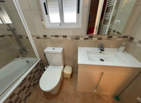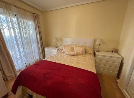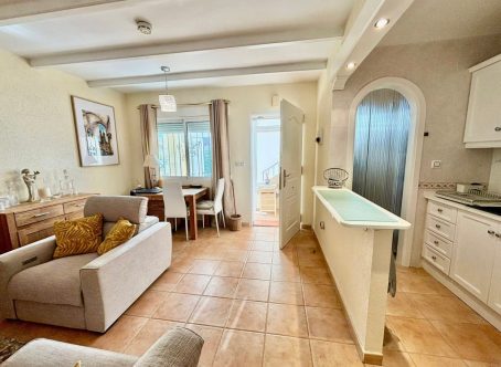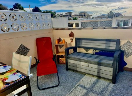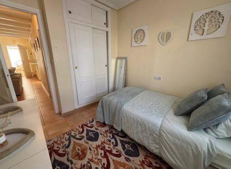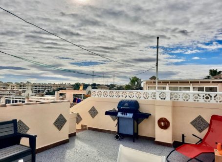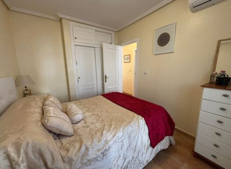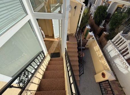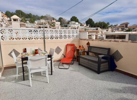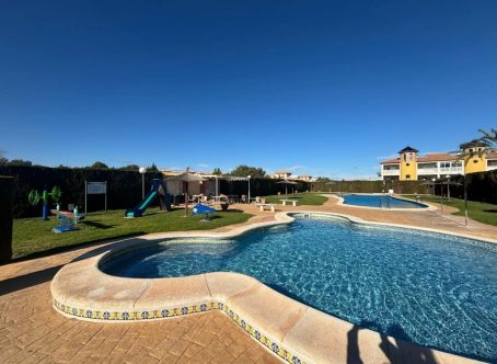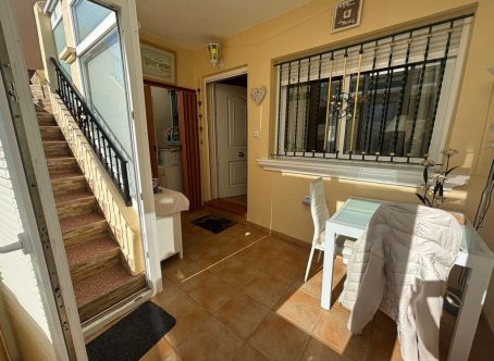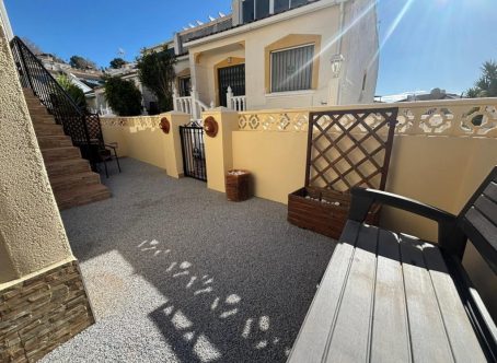 We are delighted to present this immaculate 2-bedroom house in the highly sought-after Montegolf area of Villamartín. Situated on a quiet street with off-road parking, the property is both north and south facing, providing bright and spacious living throughout. The ground floor features a welcoming lounge with a cosy fireplace, an open-plan fully equipped kitchen, a utility room, a glazed breakfast terrace, and a family bathroom. Both double bedrooms include fitted wardrobes, and additional storage is available throughout. The property is partly furnished and benefits from air conditioning units in all rooms. A sun-drenched roof solarium provides lovely open views, ideal for relaxing or entertaining. Residents enjoy access to a large communal pool and landscaped park area. The location is excellent, within walking distance to Villamartin Plaza, La Fuente Commercial Centre, shops, bars, restaurants, and several nearby golf courses. Just 45 minutes from Alicante and Murcia airports, this property is perfect as a permanent home, holiday retreat, or rental investment.