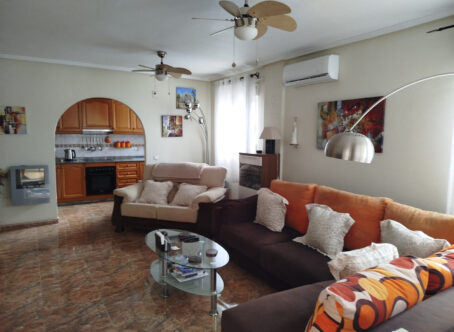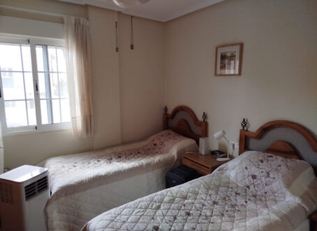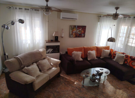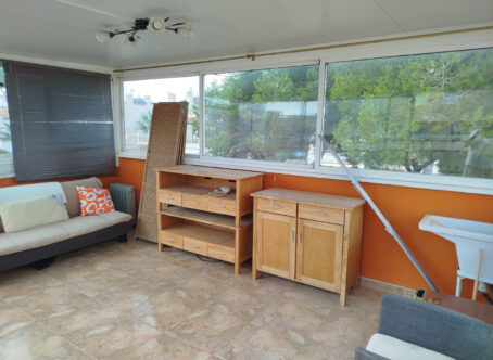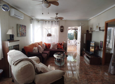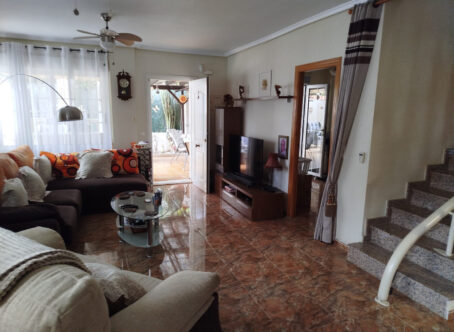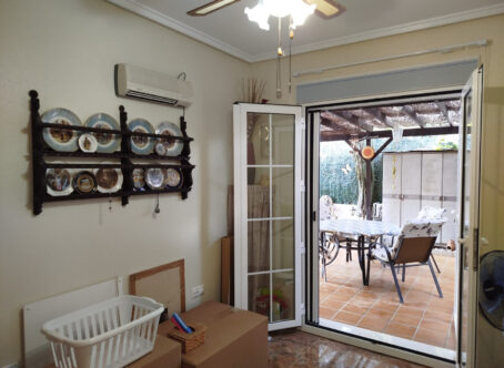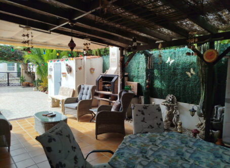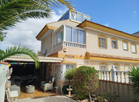 Beautiful South-Facing 3-Bedroom Semi-Detached House in Los Dolses This beautifully presented south-facing 3-bedroom, 2-bathroom semi-detached house is perfectly positioned in a quiet cul-de-sac in the highly desirable area of Los Dolses, Orihuela Costa. Offering a wonderful blend of comfort, style, and convenience, this charming home forms part of a peaceful residential community with access to a communal swimming pool. Outside, the property boasts a private driveway with off-road parking, a built-in barbecue area, a tiled sun terrace, and a timber pergola creating a shaded space ideal for outdoor dining and relaxation. A large brick-built storage shed adds excellent practicality to the garden. Inside, you are welcomed into a bright open-plan living and kitchen area. The kitchen comes fully equipped with modern appliances, while the living room includes air conditioning and ceiling fans for year-round comfort. The ground floor also features a spacious double bedroom with a ceiling fan and double doors opening directly onto the terrace, as well as a shower room with toilet and wash hand basin - perfect for guests or everyday living. Upstairs, the first floor offers two additional bedrooms, both with fitted wardrobes. The master bedroom features air conditioning, a ceiling fan, and double doors leading to a glazed terrace, ideal as a cozy reading nook or relaxation area. The second bedroom also benefits from a ceiling fan and fitted wardrobes. A full family bathroom serves this level. From the landing, a staircase leads up to the private roof solarium, which includes a conservatory - a versatile extra space that can be used as a lounge, home office, or hobby room, with lovely open views. Ideally located within walking distance of shops, bars, and restaurants, and just a short drive to beautiful beaches and La Zenia Boulevard, this property is sold fully furnished and ready to move into. It’s an ideal choice for full-time living, a holiday retreat, or a smart investment opportunity.