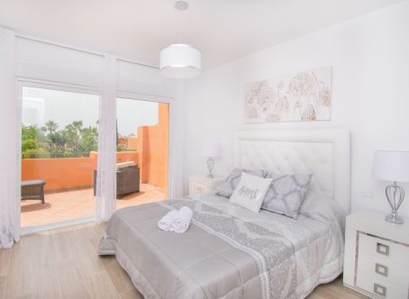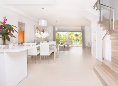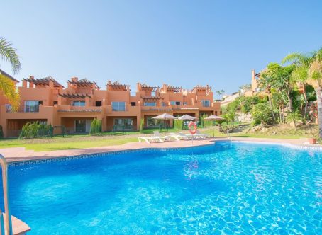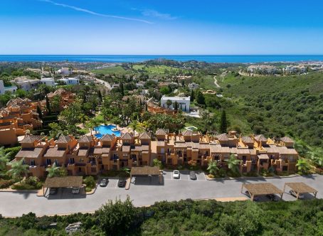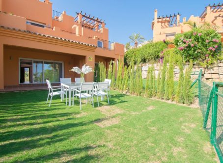 Small promotion of townhouses in a gated community near El Paraiso Golf, about 3 kms. to the beach and close to several golf courses. A quiet and secluded setting. The house faces south with views to the sea from a large terrace. On entering the ground level you find the open plan kitchen & guest toillet, living and dining room and this leads out to a covered terrace with a private garden which then connects to the communal garden and communal pool. On this floor there is also a store room and a laundry area off the kitchen. The second level has a master bedroom and bathroom ensuite, plus two bedrooms with a bathroom to share. The staircase then leads you to a spacious solarium roof terrace with views of the garden and the sea beyond. Covered and uncovered parking within the gated community with allocated parking spots for each house. Nearby are amenitues such as restaurants, supermarket, golf clubs, tennis clubs and Puerto Banus is approximately a 15 minute drive away and San Pedro about 10 minutes drive a way. Sold unfurnished.