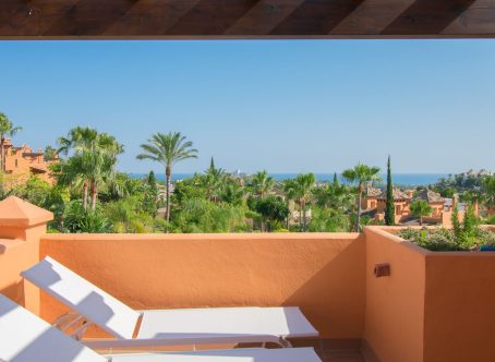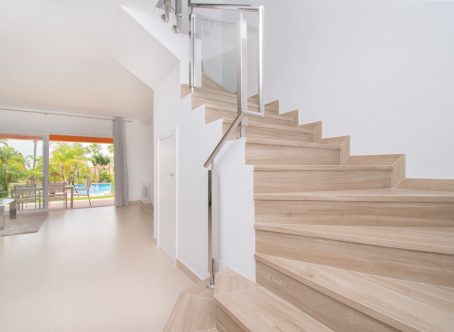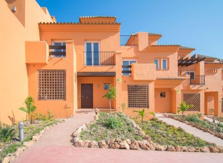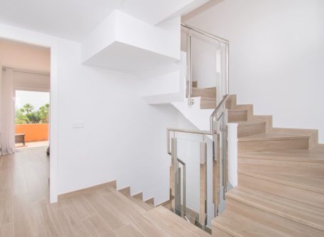 Small promotion of townhouses in a gated community near El Paraiso Golf, about 3 kms. to the beach and close to several golf courses. A quiet and secluded setting. The house faces south with views to the sea from a large terrace. On entering the ground level you find the open plan kitchen & guest toillet, living and dining room and this leads out to a covered terrace with a private garden which then connects to the communal garden and communal pool. On this floor there is also a store room and a laundry area off the kitchen. The second level has a master bedroom and bathroom ensuite, plus two bedrooms with a bathroom to share. The staircase then leads you to a spacious solarium roof terrace with views of the garden and the sea beyond. Covered and uncovered parking within the gated community with allocated parking spots for each house. Nearby are amenitues such as restaurants, supermarket, golf clubs, tennis clubs and Puerto Banus is approximately a 15 minute drive away and San Pedro about 10 minutes drive a way. Sold unfurnished.