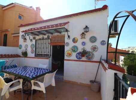 This West Facing, Three Bedroom Townhouse in Benijofar is located within walking distance of local amenities and facilities, and just a 15-minute drive from the beautiful beaches of the Costa Blanca South. Situated on a generous 488m² plot, the property boasts three bedrooms, one family bathroom, and a convenient downstairs cloakroom. The open-plan kitchen connects seamlessly to the lounge/dining room, which is fitted with air conditioning for comfort. Additionally, one of the bedrooms includes air conditioning. The townhouse is fitted with window and door grills throughout, ensuring security. Outside, the mature private garden features an impressive 8x4m private pool and a dedicated BBQ area, perfect for entertaining. There’s also a shaded outdoor dining and entertainment space, ideal for enjoying the warm Spanish climate in comfort. This charming property offers a fantastic balance of indoor and outdoor living, making it an excellent choice for a family home or holiday retreat.