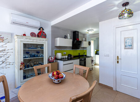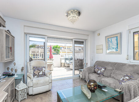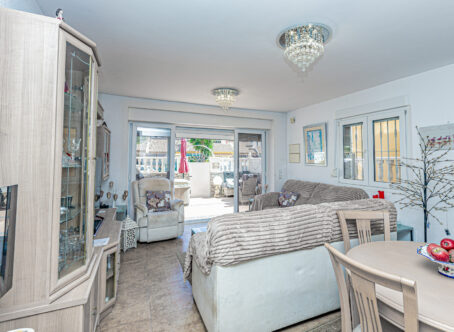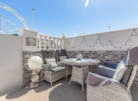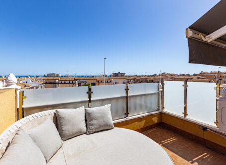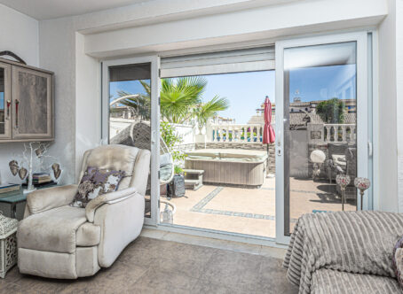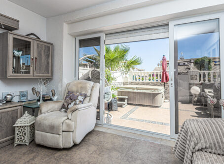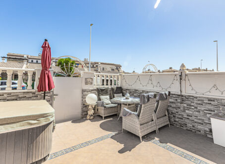 This charming terraced house is located in La Zenia, Orihuela Costa, just 900 metres from the beach, in one of the most sought-after areas of the Costa Blanca. Partially renovated, the property features an extended kitchen, offering a greater sense of space and functionality on the ground floor. At the entrance, a sunny south-facing terrace welcomes you, complete with a jacuzzi and outdoor seating – ideal for relaxing in the open air. There’s a side access to the kitchen, while the main entrance features a large sliding glass door with electric shutter, providing both natural light and comfort. The bright living-dining area connects seamlessly with the spacious open-plan kitchen. A guest toilet is also located on this floor. The first floor offers two bright bedrooms and a full bathroom. On the top floor, there’s a third bedroom with an en-suite bathroom and access to a private terrace with open sea views – perfect for enjoying the Mediterranean breeze. The property includes air conditioning in the living room and two bedrooms, and is sold fully furnished and equipped with all appliances – ready to move in. Located in lively La Zenia, a prime residential area that combines peace and convenience, the home is within walking distance of La Zenia Boulevard shopping centre, supermarkets, restaurants, and all local amenities, with easy access to major roads and nearby airports. A fantastic opportunity for anyone looking for a coastal home with every comfort.