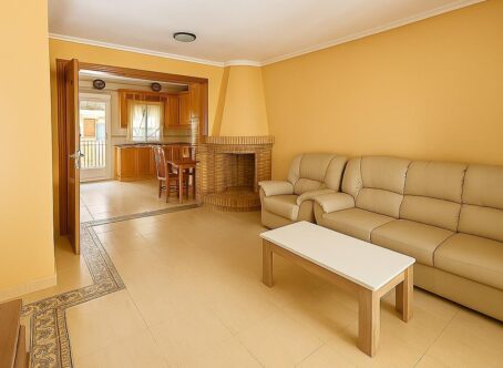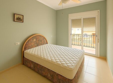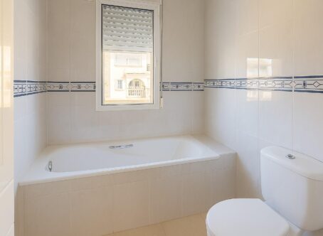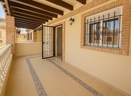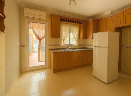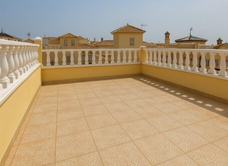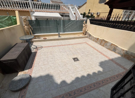 A South East facing 2 bed 2 bath townhouse located in Las Chismosas, Playa Flamenca, Costa Blanca South. This property is offered for sale in good condition & very briefly consists of the following :- The ground floor offers an open plan living/dining area with an open fireplace, an open plan kitchen with hot and cold A/C & a patio door leading to a back garden & 1 x shower room. The first floor has 2 x double bedrooms and family bathroom. There is a large private rooftop solarium. Outside there is a fully tiled front & rear garden, communal swimming pool & much more. This property is just a few minutes walk to local shops, bars, restaurants & around 10 minutes walk to the Saturday market. It is just a few minutes drive to Zenia Boulevard shopping complex & 5 minutes drive to the beach & 50 minutes drive to Alicante airport & 45 minutes to Murcia Corvera airport.