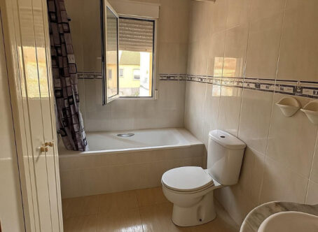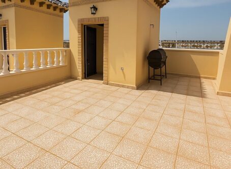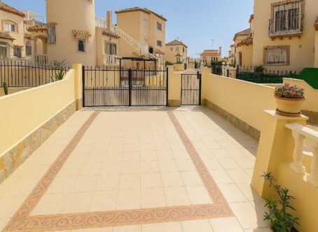 A South East facing 2 bed 2 bath townhouse located in Las Chismosas, Playa Flamenca, Costa Blanca South. This property is offered for sale in good condition & very briefly consists of the following :- The ground floor offers an open plan living/dining area with an open fireplace, an open plan kitchen with hot and cold A/C & a patio door leading to a back garden & 1 x shower room. The first floor has 2 x double bedrooms and family bathroom. There is a large private rooftop solarium. Outside there is a fully tiled front & rear garden, communal swimming pool & much more. This property is just a few minutes walk to local shops, bars, restaurants & around 10 minutes walk to the Saturday market. It is just a few minutes drive to Zenia Boulevard shopping complex & 5 minutes drive to the beach & 50 minutes drive to Alicante airport & 45 minutes to Murcia Corvera airport.