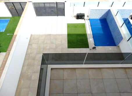 <strong>SPECIAL OFFERS APPLY - contact us for more information. </strong> Only 11 villas with three bedroom and three bathrooms, private pools and roof solarium being constructed just two roads back from the beach at Santiago de la Ribera. Plot sizes range from 116m2 to 234m2. These villas represent great value for money for being so close to the sea and a modern new build with private pool. They will not be around for long so hurry contact us to arrange to view. Downstairs is the open plan lounge diner kitchen, a downstairs bedroom and bathroom, both the bedroom and lounge have access through patio doors to the garden. Upstairs there are two further bedrooms and two bathrooms, upstairs again and there is a spacious roof solarium. Prices vary depending on plot size, contact us for more details.