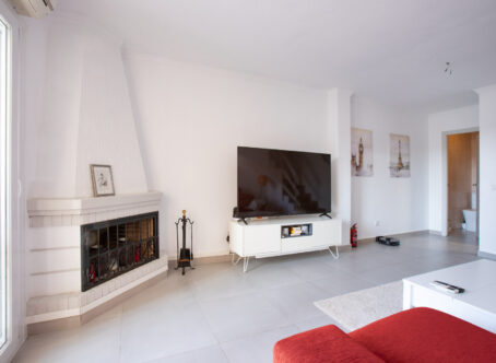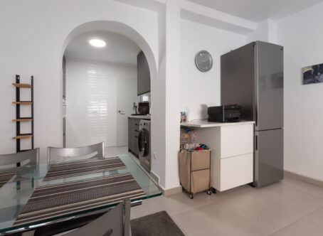 This stylish, fully renovated townhouse embodies modern design and high-quality materials across its two floors, with the addition of a private rooftop solarium-a perfect spot for relaxing and enjoying sunny days. The inviting living room on the ground floor features a cozy fireplace, creating a warm atmosphere for those cooling evenings and relaxed moments. Also on this level are a separate WC and a newly renovated, modern gray kitchen with integrated appliances. The light gray large-tiled floors enhance the sense of spaciousness and are easy to maintain. The open dining and workspace area blends seamlessly with the kitchen and living room, supporting a modern and open lifestyle. Upstairs, the Scandinavian-inspired style continues. The bedroom floors are adorned with beautiful oak laminate, adding warmth and a natural touch. The master bedroom opens onto both a private balcony and the solarium, and both bedrooms feature full-wall wardrobes offering ample, discreet storage space. The upstairs bathroom presents a serene look with light tones, complemented by trendy black accents that add a stylish contrast. For year-round comfort, the home is equipped with three air heat pumps-one in the living room and one in each bedroom. Situated in the Frutales area, this home provides convenient access to essential services and beautiful natural spots: the beach is only about 600 meters away, the Consum supermarket about 800 meters, and the Finnish market approximately 600 meters. There are also two beautiful parks nearby-Parque de San Roque, about 300 meters away, and Plaza de Sevilla, about 500 meters away. This home combines elegant renovations, modern comfort, and an excellent location near nature and services-an ideal choice for easy and high-quality living!