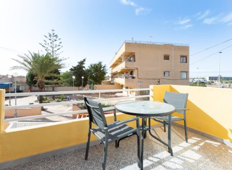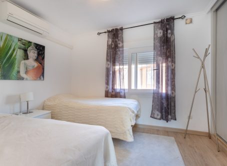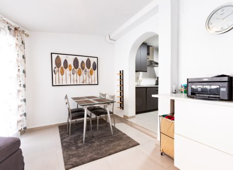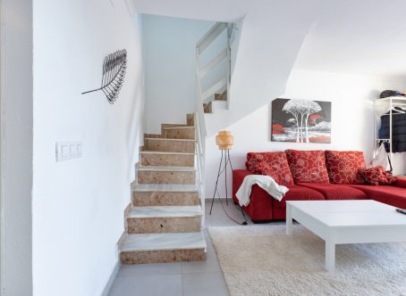 This stylish, fully renovated townhouse embodies modern design and high-quality materials across its two floors, with the addition of a private rooftop solarium-a perfect spot for relaxing and enjoying sunny days. The inviting living room on the ground floor features a cozy fireplace, creating a warm atmosphere for those cooling evenings and relaxed moments. Also on this level are a separate WC and a newly renovated, modern gray kitchen with integrated appliances. The light gray large-tiled floors enhance the sense of spaciousness and are easy to maintain. The open dining and workspace area blends seamlessly with the kitchen and living room, supporting a modern and open lifestyle. Upstairs, the Scandinavian-inspired style continues. The bedroom floors are adorned with beautiful oak laminate, adding warmth and a natural touch. The master bedroom opens onto both a private balcony and the solarium, and both bedrooms feature full-wall wardrobes offering ample, discreet storage space. The upstairs bathroom presents a serene look with light tones, complemented by trendy black accents that add a stylish contrast. For year-round comfort, the home is equipped with three air heat pumps-one in the living room and one in each bedroom. Situated in the Frutales area, this home provides convenient access to essential services and beautiful natural spots: the beach is only about 600 meters away, the Consum supermarket about 800 meters, and the Finnish market approximately 600 meters. There are also two beautiful parks nearby-Parque de San Roque, about 300 meters away, and Plaza de Sevilla, about 500 meters away. This home combines elegant renovations, modern comfort, and an excellent location near nature and services-an ideal choice for easy and high-quality living!