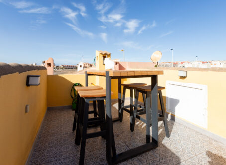 This stylish, fully renovated townhouse embodies modern design and high-quality materials across its two floors, with the addition of a private rooftop solarium-a perfect spot for relaxing and enjoying sunny days. The inviting living room on the ground floor features a cozy fireplace, creating a warm atmosphere for those cooling evenings and relaxed moments. Also on this level are a separate WC and a newly renovated, modern gray kitchen with integrated appliances. The light gray large-tiled floors enhance the sense of spaciousness and are easy to maintain. The open dining and workspace area blends seamlessly with the kitchen and living room, supporting a modern and open lifestyle. Upstairs, the Scandinavian-inspired style continues. The bedroom floors are adorned with beautiful oak laminate, adding warmth and a natural touch. The master bedroom opens onto both a private balcony and the solarium, and both bedrooms feature full-wall wardrobes offering ample, discreet storage space. The upstairs bathroom presents a serene look with light tones, complemented by trendy black accents that add a stylish contrast. For year-round comfort, the home is equipped with three air heat pumps-one in the living room and one in each bedroom. Situated in the Frutales area, this home provides convenient access to essential services and beautiful natural spots: the beach is only about 600 meters away, the Consum supermarket about 800 meters, and the Finnish market approximately 600 meters. There are also two beautiful parks nearby-Parque de San Roque, about 300 meters away, and Plaza de Sevilla, about 500 meters away. This home combines elegant renovations, modern comfort, and an excellent location near nature and services-an ideal choice for easy and high-quality living!