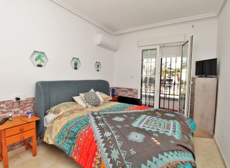 This attractive Sofía-style townhouse is situated in the well-established R19 development in Los Dolses, enjoying a prime location just steps from the communal swimming pool. The property features a front tiled terrace with open views over the pool, providing a pleasant space to relax and enjoy the surroundings. Inside, the ground floor comprises a bright lounge-dining area, a fitted kitchen to the rear with access to a private patio, and a convenient guest WC. Upstairs, there are two double bedrooms with fitted wardrobes and a family bathroom. The main bedroom benefits from a private balcony with views of the communal pool and gardens. From the first-floor landing, internal stairs lead to a private roof solarium, offering additional outdoor space perfect for sunbathing or entertaining. The townhouse is sold furnished, including white goods, and the community offers off-road communal parking for residents. Ideally located close to shops, bars, restaurants, and other amenities, and within easy reach of golf courses and the beaches of Orihuela Costa, this property represents an excellent opportunity in one of Los Dolses’ most popular residential areas.
