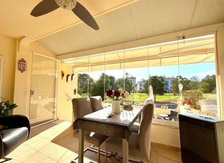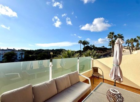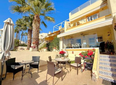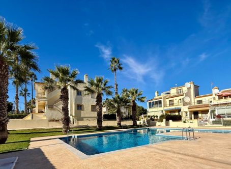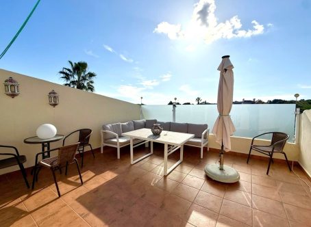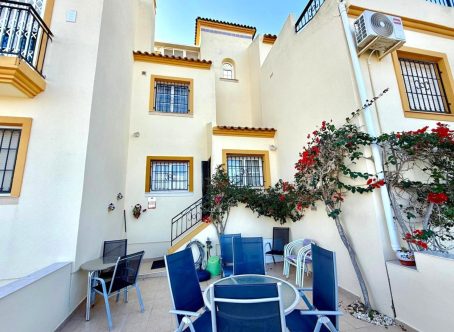 This beautifully presented Sofia townhouse is located in a quiet and sought-after area of Villamartin, offering a comfortable home within easy reach of local amenities, golf courses, and the stunning beaches of Orihuela Costa. The property features a bright and airy living space, including an open-plan lounge and dining area that leads seamlessly to a sunny terrace-ideal for outdoor dining and relaxing in the Mediterranean climate. The modern kitchen is fully equipped and designed for functionality and style. There are two double bedrooms, including a master with an en-suite bathroom, providing privacy and comfort for family or guests. Additional features include a fully fitted family bathroom, ample storage, and access to a roof terrace with panoramic views of the surrounding area and golf courses. Externally, the townhouse benefits from a private garden, sun terrace, and off-street parking. The property is sold furnished and includes air conditioning, white goods, and quality fixtures throughout, making it ready to move in or use as a holiday home. Residents also have access to a communal swimming pool and landscaped gardens, creating a safe and friendly environment. With its excellent location, stylish design, and practical layout, this Sofia townhouse represents an ideal investment or permanent residence in Villamartin.