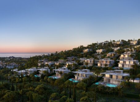 A luxury gated community with villas built to a very high standard, this five bedroom villa has sea and golf views. Built with a modern design and with an interior finish designed by Lamborghini being one of the first branded residences in Marbella. Situated on a hillside on the north side of El Paraiso golf course and very near Hotel Villa Padierna and Los Flamingos golf course and the Marbella Club golf resort with it's exclusive horse riding facilities. A refined, classy and sophisticated villa on a gentle slope offering stunning views from every room. With five bedrooms and plenty of common spaces, this villa has a wine cellar and a multipurpose room which could be a gym or a games room. Tailor made finishings and high end materials enhance the generous open-spaces for a sublime living experience. Underfloor heating, hot and cold air-conditioning, double glazed windows, top quality brands for kitchen appliances, and bathroom fittings and for floor tiles. On the main level is a large living area with an open plan kitchen and a large guest bedroom. On the upper floor are three bedroom suites plus the large master suite. In the basement there is another bedroom and bathroom for staff, with a kitchen for the staff, a spa with sauna and steam room, a cinema room and a large multi purpose room. And a roof terrace with great views and area for a bar, seating and sun bathing. The villa has parking for two cars, a lift which goes to all floors including the roof terrace, and there is a premium 24/7 security service for this gated luxury complex.