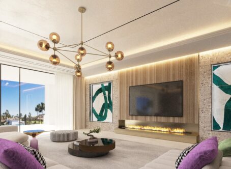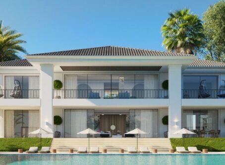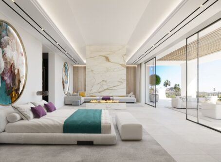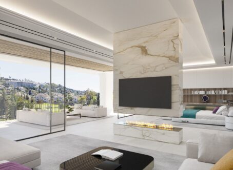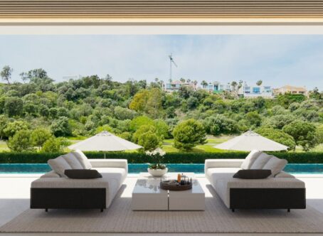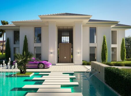 New project of a contemporary design villa on the first line of the La Alqueria golf course. Quality materials and finishes, as well as a beautiful panoramic view of the golf course. 616 m2 built on 2 levels plus large basement. Immense terraces on 131 m2. Nearby is a Mercadona supermarket, resytaurants, golf courses and an International school.