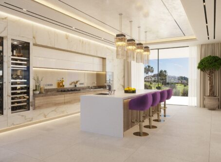 New project of a contemporary design villa on the first line of the La Alqueria golf course. Quality materials and finishes, as well as a beautiful panoramic view of the golf course. 616 m2 built on 2 levels plus large basement. Immense terraces on 131 m2. Nearby is a Mercadona supermarket, resytaurants, golf courses and an International school.