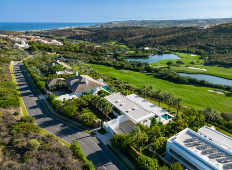 This astonishing villa is the embodiment of luxury golfside living. Meticulously designed by the esteemed architects Vicens & Romans, this opulent residence showcases an unrivalled architectural marvel, unmatched in the Costa del Sol. Nestled on a spacious frontline golf plot, the villa boasts expansive floor-to-ceiling windows that flood the interiors with an abundance of natural light, unveiling breathtaking views of the Finca Cortesin golf course and the Mediterranean sea from its elevated vantage point. Encapsulated by lush greenery, privacy and tranquillity are guaranteed. With generous outdoor terraces and easy access to the garden from all areas, indoor/outdoor living is maximised for residents to make the most out of the stunning weather this corner of the world has to offer. The length pool, decorated with stunning aquamarine tiles invites all to take a dip, while the luscious palm trees provide shade and an aesthetic backdrop for relaxation. The interiors exude refinement, with every detail meticulously curated using the finest materials, ensuring an unparalleled sense of luxury. The stunning kitchen, equipped with state-of-the-art Gaggenau appliances, is a culinary haven that seamlessly combines practicality with aesthetics. Distributed across 2 floors, most bedrooms are located on the ground level of the property, with striking views across the golf course. The luxurious master bedroom is on the top level of the property, boasting a private oasis for residents to enjoy. The property's landscaping is a work of art, with a captivating hidden pond gracing the entrance, adorned with lush greenery that evokes a soothing ambiance, fostering a profound connection with nature. An architectural masterpiece, this property enjoys a privileged frontline golf position in one of Spain’s most exclusive resorts.
