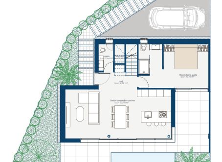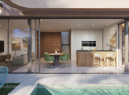 A superb opportunity to buy a brand new villa situated within a gated and established golf resort with 24 hour security. The resort boasts a desert style 18 hole golf course by Nicklaus Design, practise facilities, a supermarket, a stunning clubhouse, tennis courts and other sports facilities. Located 10-15 minutes drive from Murcia City, 10 minutes from Murcia International airport and 1 hour from Alicante airport. The beach is a 15 minute drive away. These villas are finished to the highest standards, being constructed by a well established developer with a history of building excellent quality developments. This South-West facing villa offers accommodation over two storeys with one bedroom being on the ground floor. On the ground floor there is a spacious living room with open plan kitchen (appliances included), master bedroom with en suite shower room and a downstairs WC. On the first floor there are two further double bedrooms and a family bathroom. The villas benefit from private swimming pools in the rear gardens. Vented air conditioning is included with an option to upgrade to an Airzone climate control system. These apartments also have video-phone entry systems. Outside there are landscaped gardens and a communal swimming pool. Contact us to arrange a tour of this brand new development.