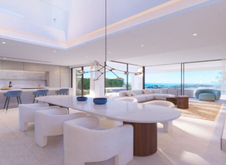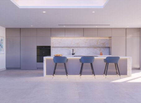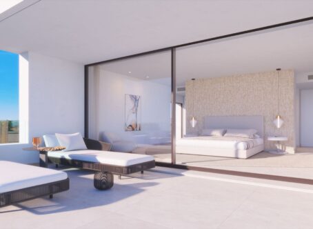 The very concept behind this new development is to create homes that are the epitome of contemporary style and comfort, where you can create your own ideal lifestyle on the Mediterranean.A great deal of attention has therefore gone into the design and flow of the Villas, and its specialist expertise to produce something truly outstanding. Purity of design, The result is a purity of design that has been brought to life by the creative mastery of the architect, whose clean white lines are softened by gentle curvature and the use of noble materials. Form and function – interior and exterior – are beautifully balanced in these stylish modern homes that capture the sea breeze and offer a spacious terrace on which to enjoy 320 sunlit days per year and entertain in style at night.Each individual Villa is designed with tall, double-height ceilings and full-length windows to create bright, luminous living spaces that let in views of the surrounding nature. Specially selected quality materials offer a visual and tactile delight while bringing sophisticated design to life. A sense of space and wellbeing These Villas blend contemporary style and spacious open-plan living areas to create a modern home endowed with the latest technology and colour schemes that draw inspiration from the natural environment. Let the sliding doors glide open and your elegant interior living spaces are extended outwards for refinement and style in the open air, with spacious open and covered terraces featuring large format marble tiles in anti-slip matt finish that overlook the pool and garden. Two very important parts of the master bedroom suite are the bathroom and the dressing room, for they make it stand out in terms of quality and features. The master bathroom therefore offers clean, contemporary styling in combination with fine quality materials such as top-of-the-range ceramic tiles, elegant modern sanitary ware and raindrop showers that create a wonderful sensory effect. Designed for your convenience The dressing room is similarly designed to combine practicality and style, with expert carpentry ensuring that drawers glide, clever use of space allows you to keep your clothes and accessories in style, and attractive lighting and finishing, making this a quality feature in your home. From the carpentry of the dressing area to the quality materials used in the bathroom and the stylish glass railing of the terrace, your master suite is a comfortable private domain.