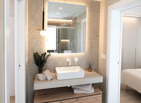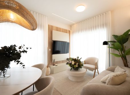 <strong>SPECIAL OFFERS APPLY – contact us for more information. </strong>Stunning three bedroom two bathroom villas being built on La Serena golf and there are options either west or east facing and some on large plots. La Serena Golf is close to the beach of Los Alcazares and these properties come with underground parking, storage room, owners gym and spa area too. This is a well thoughtout property and the footprint flows really well. As you come through the front door there is an entrance hall that leads to the the lounge which has patio doors to the garden. The kitchen is open plan with an island and comes with white goods and has a door leading to the BBQ and dining area. On this level there is a double bedroom with fitted wardrobes and ensuite bathroom and there is also a separate wc under the stairs. Upstairs are two further bedrooms with fitted wardrobes and a jack and jill family bathroom. One of the bedrooms has patio doors to the first floor terrace. Up internal stairs is the roof solarium and there is an optional extra to have a fully fitted summer kitchen with motorized blind. The garden wraps around the property creating different zoned areas. To the front is the pool and space for a car as it is terraced and to the side is a grassed area ideal for sunbathing by the pool and at the rear is another terraced area with outside WC and BBQ area.
