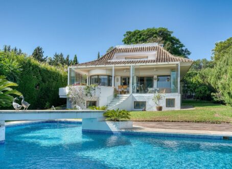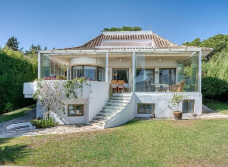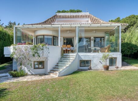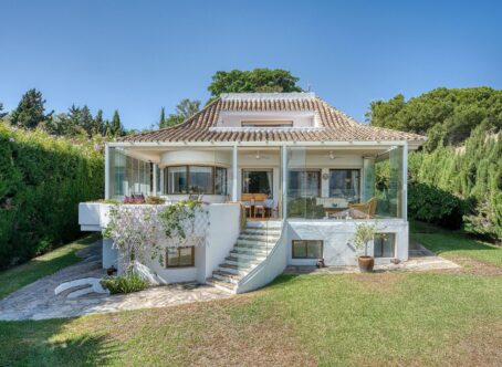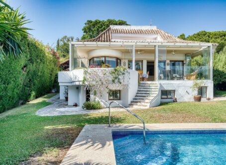 Villa situated in the heart of the exclusive residential area surrounding Las Brisas 18 hole championship golf course. The villa was originally built in 1985 and has had renovations in bathrooms, kitchen and terrace area. As the property is situated on a higher level second line to the golf course, there are nice views of the golf, the valley and Marbella's iconic "La Concha" mountain. On the entrance level is the kitchen, dining area and lounge which leads out to a covered terrace with glass curtains which makes this an extension of the living room throughout the year. From the covered terrace there are steps leading down to the garden and pool. Also on the entrance level are two bedrooms sharing a bathroom plus an ensuite bedroom. Upstairs is the master suite with bathroom and dressing area incorporated. The bedroom leads out to a terrace with lovely views. Below the covered terrace is a semi-basement area where there is an independant accomodation with bedroom, living room and kitchenette incorporated plus a bathroom. Behind this area is a hollow area where the basement could probably be extended. There is also a garage plus a covered parking area for two medium size cars. The villa is situated in the best area of Nueva Andalucia and has great potential to be modernised.