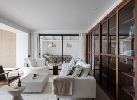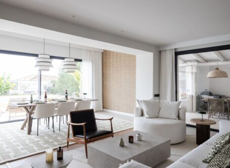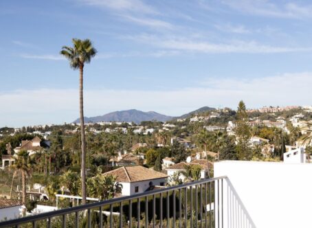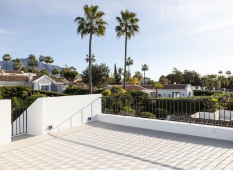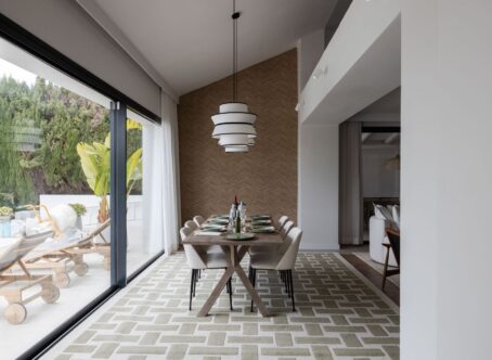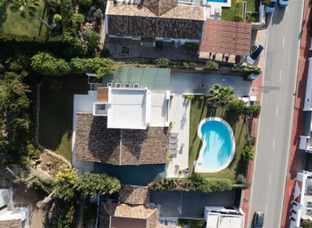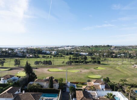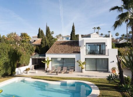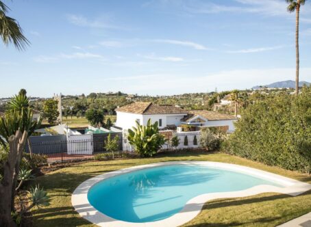 Tastefully renovated villa with a Scandinavian touch situated near Los Naranjos Golf Club in Nueva Andalucia. Facing south the villa has views over lush green surroundings of the golf valley. On the ground foor is the open plan kitchen connected to the dining area where a high ceiling enhances the openness feel. The floor to ceiling windows allow alot of natural light in and opens out to the terrace, pool and garden creating a pleasant flow. The living room has a built in bookcase, open fire and wooden floors. The luxury kitchen has nogal cabinets, marble worktop and Miele appliances. On the ground floor are three bedrooms and two bathrooms, a guest WC and a store room. On the next floor there is a family/tv or games room and the spacious master suite with dressing area. From here you can also access a sunny and private roof terrace with good views. There is underfloor heating in bathrooms, hot and cold air-conditioning throughout, car port for 3 cars and a desalination system. The pool is prepared for chlorine or for saltwater. A villa with a alot of charm and coziness which will make a great home.