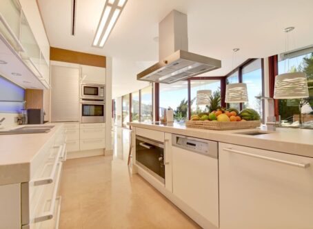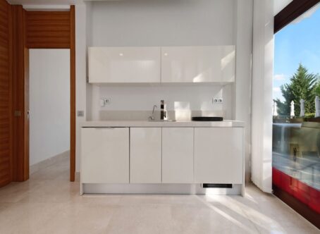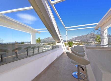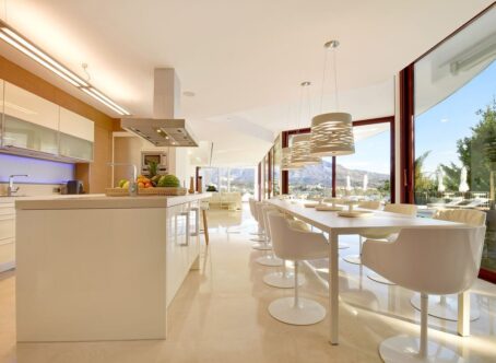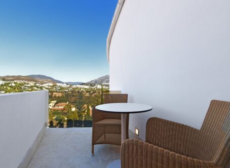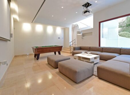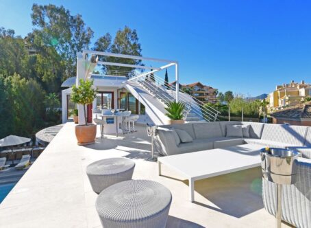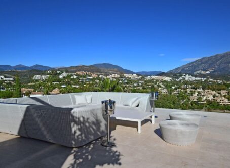 From the main entrance the living room in its white interior floats together with the beautiful natural light coming in from the full-size windows facing the view and pool area. Turning to the right – the fully equipped kitchen presents itself with a dining area fitting 16 people. From the kitchen area, there is direct access to the second kitchen and laundry room with washing machine and tumble dryer. Outside you have a spacious terrace with palm trees, a large heated infinity pool and Jacuzzi. The outstanding barbecue area is ideal for entertaining and dining under the stars, while the partly covered bar and the lounge seating on the second floor terrace can lift the atmosphere from great cosiness to a great party with total privacy and views towards the mountains and the sea. This is truly a stunning luxury home. The 7 bedrooms (sleep 16) are positioned well apart for total privacy. You will find two master bedrooms bedrooms on the second floor with access to the bar and lounge area. The impressive master bedrooms is spacious with great en-suite bathrooms, with views overlooking the valley leading to the sea. Ground floor has 5 bedrooms with 6 king size beds and 4 en suite bathrooms, all with access to terrace and pool area. You will also find the out-side gym and lounge. A cinema room with all features including play station 4 and pool table. The house is built with quality materials and has unique features such as external and internal lighting with the latest energy saving LED technology. Surround sound speakers. Poggenpohl kitchen units with Gaggenau white goods, including several refrigerators/freezers, wine cooler and ice cube machine. Second floor Bar with cupboards, dishwasher, drinking water, refrigerators, wine cooler, ice cube machine, freezer and teppanyaki dining table. A 5 person Jacuzzi next to the pool and 8 persons luxury Jacuzzi on the top terrace with a panoramic view over the beautiful La Concha Mountain, las Brisas golf and the Mediterranean Sea.