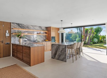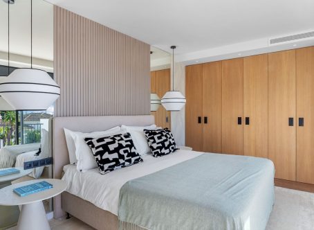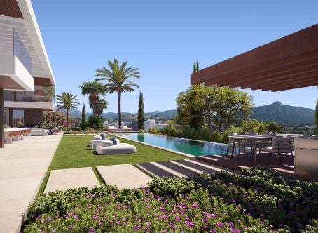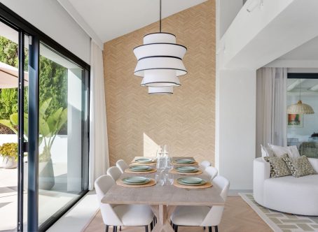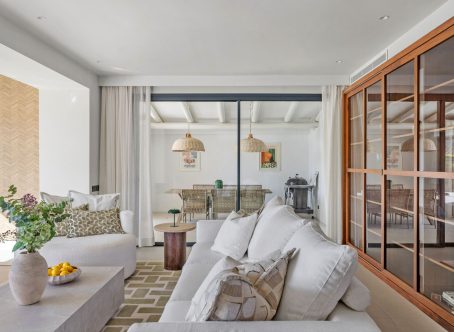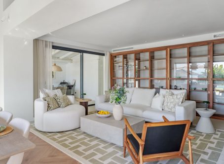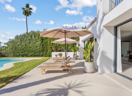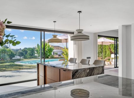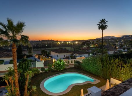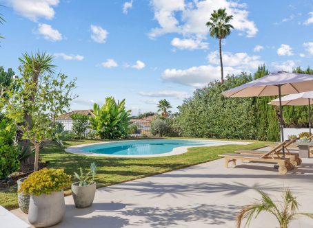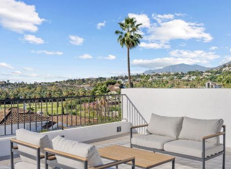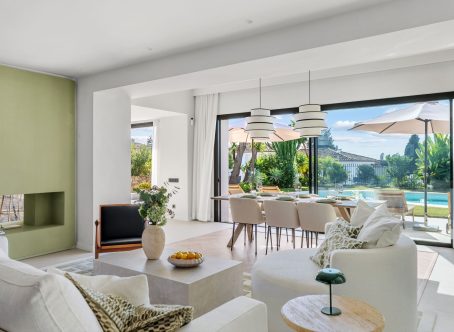 Tastefully renovated villa with a Scandinavian touch situated near Los Naranjos Golf Club in Nueva Andalucia. Facing south the villa has views over lush green surroundings of the golf valley. On the ground foor is the open plan kitchen connected to the dining area where a high ceiling enhances the openness feel. The floor to ceiling windows allow alot of natural light in and opens out to the terrace, pool and garden creating a pleasant flow. The living room has a built in bookcase, open fire and wooden floors. The luxury kitchen has nogal cabinets, marble worktop and Miele appliances. On the ground floor are three bedrooms and two bathrooms, a guest WC and a store room. On the next floor there is a family/tv or games room and the spacious master suite with dressing area. From here you can also access a sunny and private roof terrace with good views. There is underfloor heating in bathrooms, hot and cold air-conditioning throughout, car port for 3 cars and a desalination system. The pool is prepared for chlorine or for saltwater. A villa with a alot of charm and coziness which will make a great home.