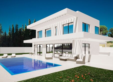 This contemporary 2-level villa is designed considering optimised distribution of space, natural illumination, and ventilation in all rooms, and with the perfect exploitation of each square meter of the house, which means - no wasted space or energy! The entrance of the villa opens into a spacious entrance hall with wardrobes, leading to the spacious living room with open plan kitchen with an integrated kitchen island. Large floor-to-ceiling energy efficient windows give you direct access to the pool and the garden area. There is also a guest toilet on the ground floor. A magnificent living room area has been designed to fully enjoy and contemplate the beautiful views that Costa del Sol has to offer. Floating glass staircase leads you to the upper floor where you will find two large bedrooms with a shared bathroom and a lot of built-in wardrobe space. A master bedroom is equipped with an ensuite bathroom and a large walk-in wardrobe. You can access the roof terrace directly from the first floor through well designed staircase. The roof terrace has pre installation for solar panels. There are many flexible options for you as the buyer of this project. Building permit was applied for in march 2023 and is expected soon. You can add a full basement with cinema room/ game room, laundry room, separate kitchen, wine cellar, sauna and possibility to make extra rooms as well. The villa is also designed so you can easily make a 4th bedroom on the ground level. The outside area offers spacious covered terraces, a beautiful private pool and a landscaped garden plus your own private parking space for two cars, connected to the villa.