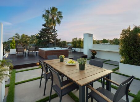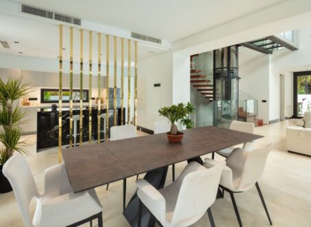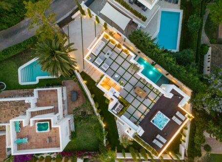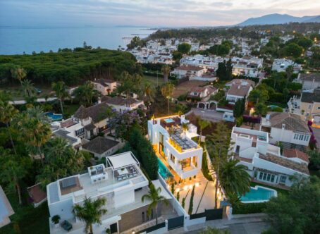 This villa is located in a well established beachside urbanisation with easy access to the beach and all amenities of Marbella Golden Mile. The villa combines designer architecture and interiors with all the modern comforts, set within a utopian setting just moments from the beach. This five-bedroom property is located in a small and exclusive residential area, a short walk from the centre of Marbella and offering privacy and tranquillity. Modernist architectural edges of glass and concrete is complemented by the addition of wooden facades and botanical bricks to create vast living walls. This eye-catching exterior is perfectly balanced by the interiors, which offer designer living and the best home comforts including a 5-star spa, high tech domotic system and luxurious use of materials including Negro Marquina marble and stone while providing respect to the environment. Construction finished and ready to move into.