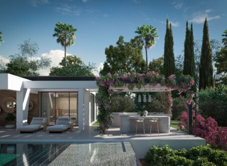 These villas combine luxury and nature in an exceptional environment. Three unique villas built on one floor and designed to enjoy the Mediterranean lifestyle in a relaxed way, imagine melting into the sun’s rays, relaxing in the chill-out area by the pool, picking fresh vegetables from your own garden or letting you rock in a sunbed at sunset on a lazy summer afternoon. The villas have been carefully studied, with a special architectural design where each house has been projected on one floor, and also has its own landscaping and ecological garden to enjoy the freshness of nature. Exterior areas will have large terraces, garden areas, swimming pool and chill out area with winter fire. The villas have an underground garage and a large basement that can be customized to the taste and lifestyle of each family. The most advanced technologies shall be used such as Aerothermia, LED lighting, Home automation system controlled by Apple iPad, WI-Fi 32GB and the best brands such as Technal for windows, Neff for kitchen, and Vileroy & Boch for bathrooms. All this will give you a comfortable, modern and efficient home for 21st century living. The interiors will have a combination of natural colours and the use of wood creating an exceptional sensation of absolute comfort and an intimate union with nature. The house will have underfloor heating and air-conditioning, and luxury equipped kitchens.