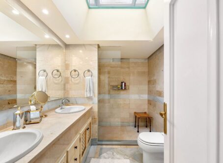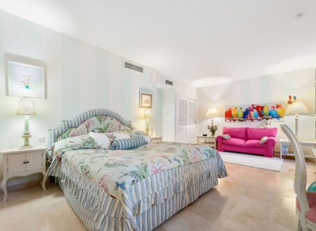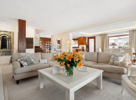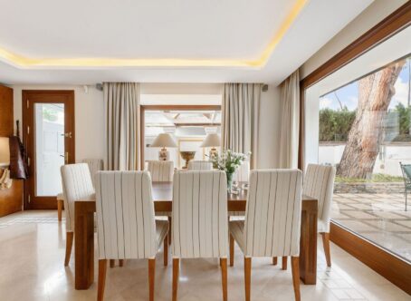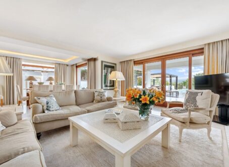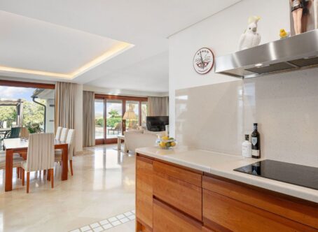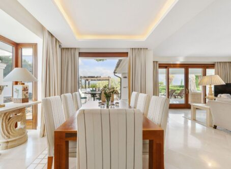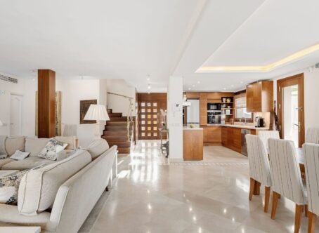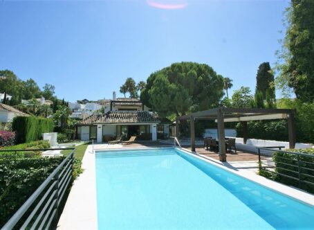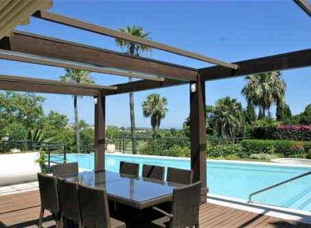 Unique villa overlooking Las Brisas golf course with lovely views of the golf course, the valley and "La Concha" mountain. This is a privately owned villa which has been used for short holiday stays by one family for many years. They have been very meticulous in the maintenance and the villa has been kept in good order. These type of villas rarely come onto the market but due to personal circumstances they are now considering to sell. The villa has a long infinity heated pool which juts out over the golf course giving you the sensation of swimming over the golf course. The spacious living room leads out to a covered porch which then leads out to the pool area. The open plan kitchen and dining room also open out to an outdoor covered dining area which connects with another open air dining area by the pool. On the ground level there is a guest WC, two bedrooms and two bathrooms. One of these bedrooms is large and has a seating area. This seating area could be easily turned into another bedroom. Upstairs is the master suite with a dressing area, ensuite bathroom and a private terrace with beautiful views. In the basement there is a wine cellar and a store room and a laundry room. This area could be modified to incorporate a small gym and a cinema room. There is a garage and a covered parking area. Underfloor heating and air-conditioning
