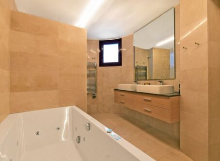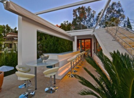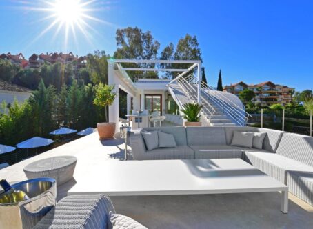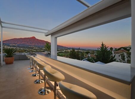 From the main entrance the living room in its white interior floats together with the beautiful natural light coming in from the full-size windows facing the view and pool area. Turning to the right – the fully equipped kitchen presents itself with a dining area fitting 16 people. From the kitchen area, there is direct access to the second kitchen and laundry room with washing machine and tumble dryer. Outside you have a spacious terrace with palm trees, a large heated infinity pool and Jacuzzi. The outstanding barbecue area is ideal for entertaining and dining under the stars, while the partly covered bar and the lounge seating on the second floor terrace can lift the atmosphere from great cosiness to a great party with total privacy and views towards the mountains and the sea. This is truly a stunning luxury home. The 7 bedrooms (sleep 16) are positioned well apart for total privacy. You will find two master bedrooms bedrooms on the second floor with access to the bar and lounge area. The impressive master bedrooms is spacious with great en-suite bathrooms, with views overlooking the valley leading to the sea. Ground floor has 5 bedrooms with 6 king size beds and 4 en suite bathrooms, all with access to terrace and pool area. You will also find the out-side gym and lounge. A cinema room with all features including play station 4 and pool table. The house is built with quality materials and has unique features such as external and internal lighting with the latest energy saving LED technology. Surround sound speakers. Poggenpohl kitchen units with Gaggenau white goods, including several refrigerators/freezers, wine cooler and ice cube machine. Second floor Bar with cupboards, dishwasher, drinking water, refrigerators, wine cooler, ice cube machine, freezer and teppanyaki dining table. A 5 person Jacuzzi next to the pool and 8 persons luxury Jacuzzi on the top terrace with a panoramic view over the beautiful La Concha Mountain, las Brisas golf and the Mediterranean Sea.