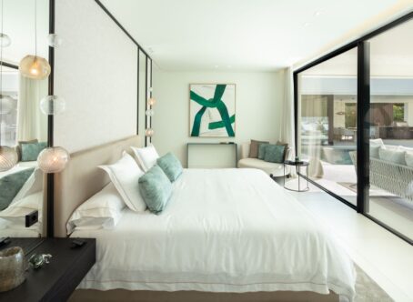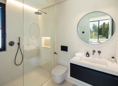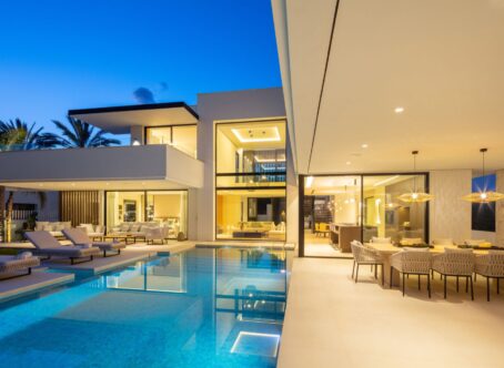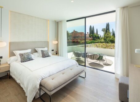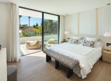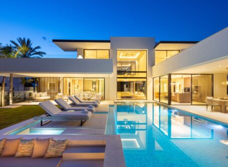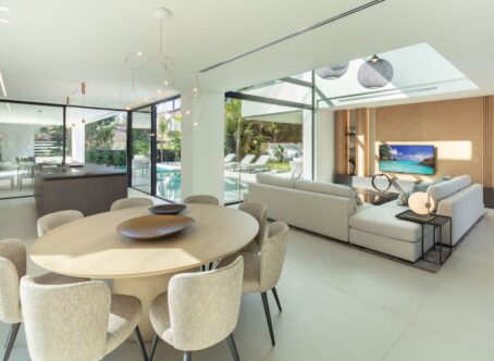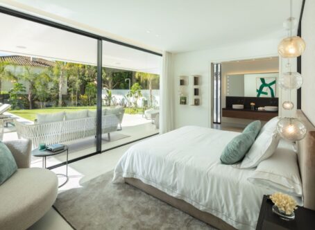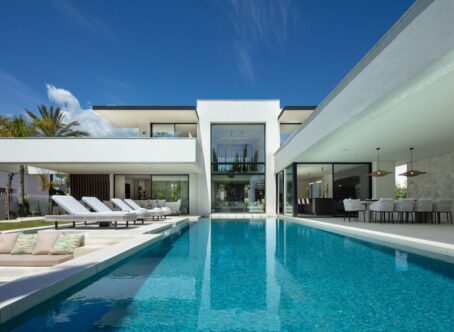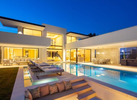 A modern villa located in the desirable area of Las Brisas, Nueva Andalucía, and within walking distance of restaurants and supermarket. The property features a beautifully landscaped garden with a private swimming pool and a sunken chill-out area. Spacious terraces provide an outdoor kitchenette, dining area, and multiple lounge spaces, offering the perfect setting for entertaining or relaxing in the sun. The interior boasts an open-plan design with a bright living room, dining area, and a fully equipped modern kitchen with high-end appliances. The villa offers five well-sized bedrooms, including a large master suite with a walk-in wardrobe and an en-suite bathroom with premium finishes. Floor-to-ceiling windows throughout the home create a seamless flow between indoor and outdoor living spaces. Additional amenities include an entertainment level with a billiard table, sauna, and a gym/yoga room. Located in the heart of Nueva Andalucía, Villa Sirius is just minutes from top golf courses, international schools, shops, and restaurants, making it an excellent choice for both permanent living and holiday stays.