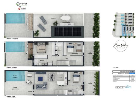 <strong>SPECIAL OFFERS APPLY - contact us for more information. </strong> Located in the town of Pilar de la Horadada that has a plethora of amenities, bars, cafes, restaurants, supermarkets ect and they are just a 11 minute bike ride to the beautiful beaches in Torre de la Horadada. They are ready in April 2026 so not long to wait for your new home in the sun. These villas have a good sized garden with private pool and space to park your car. On entering the property you will find the open plan lounge kitchen diner which has patio doors to the garden. There is a downstairs bedroom with fitted wardrobes and patio doors to the rear patio courtyard, a downstairs bathroom and a separate utility room for the aerothermal 100L boiler and washing machine. Upstairs there are two further double bedrooms with fitted wardrobes, a family bathroom and the master bedroom has its own ensuite bathroom and patio doors to another terrace. Up a further flight of stairs is the roof solarium that has a summer kitchen and 6 solar panels. These properties come with white goods except the washing machine, LED lights, preinstallation of vented AC and a home automaton system that controls the motorized blinds, the pool filtration system, outdoor lights and climate control. Contact us to arrange to view the showhouse and other similar properties.