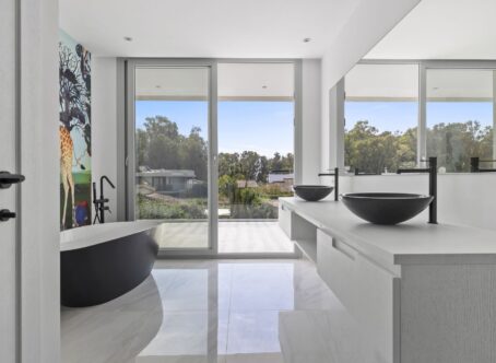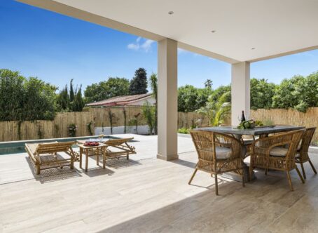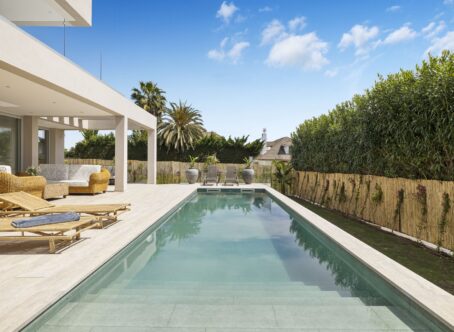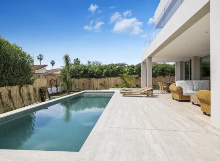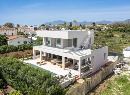 Newly built quality villa on the beach side of San Pedro de Alcántara. Build to the highest German qualities. Walking distance to the beach and the paseo of San Pedro. Main floor: Entrance, living and dining area with an fully open plan kitchen with Bosch appliances, guest toilet, one guest bedroom en suite. Access from all areas to the covered and open terraces and the private pool. First floor: Master bedroom en suite with dressing area and one guest bedroom en suite. Private terraces. Roof terrace. Lower floor: A separate apartments with another fully fitted kitchen, one guest bedroom en suite and an entertainment area or gym. Inside parking for two cars. The furniture could be negotiated. A unique location !