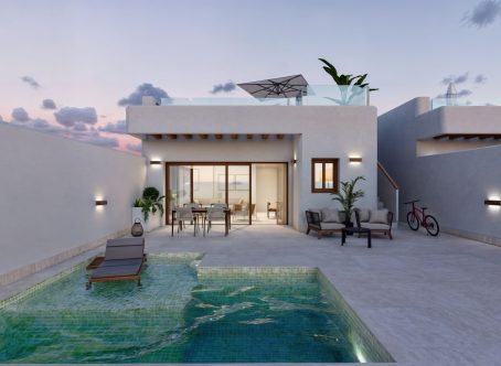 <strong>SPECIAL OFFERS APPLY - contact us for more information. </strong> New release of two bedroom one storey villas in the town of Torre Pacheco. Great location as close to everything you could need, schools, Tennis club, Football ground, supermarkets, doctors and bars and restaurants. Ready SOON! This modern villa has a light and airy 27m2 open plan lounge kitchen diner with large patio doors that lead onto the garden where you will find space for a car, 12m2 pool and stairs that lead to the 68m2 solarium which comes with a summer kitchen to enjoy al fresco dining while watching the sunset. The master bedroom has a large walk in wardrobe, ensuite bathroom and patio doors to the garden. There is a further bedroom with fitted wardrobes and also another bathroom. The property comes with white goods except for the washing machine and also LED lights. We think these are great value for money contact us to arrange to view.