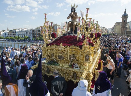 Holy Week in Seville, Spain. The procession is seen here crossing the Bridge of Triana.